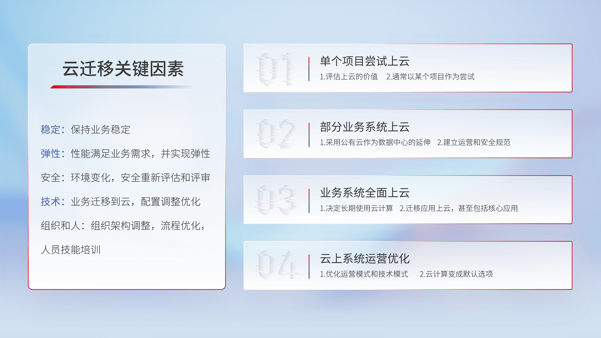 结合实际业务,,,从规划设计、、云平台选型、、云原生改造、、、、数据迁移、、、、集成交付,,,迁移全过程为客户识别最佳上云路径,,,,做好风险识别管理,,设计网络架构、、、、身份权限、、安全审计合规、、操作审计、、、、日志审计、、监控告警策略、、、、多站点容灾设计等,,,,对云上基础设施进行整体规划,,提升IT治理水平,,,,以满足弹性、、、、高可用、、高性能的需求。。。