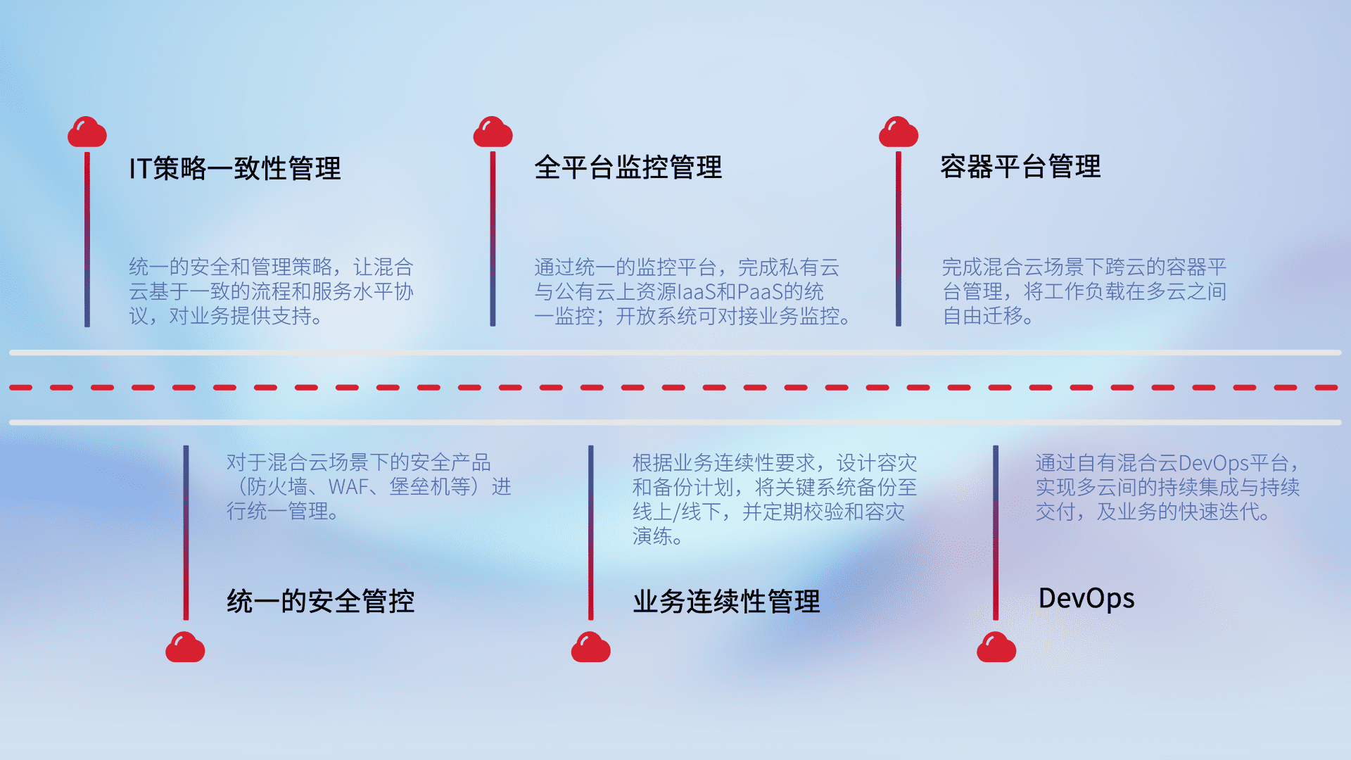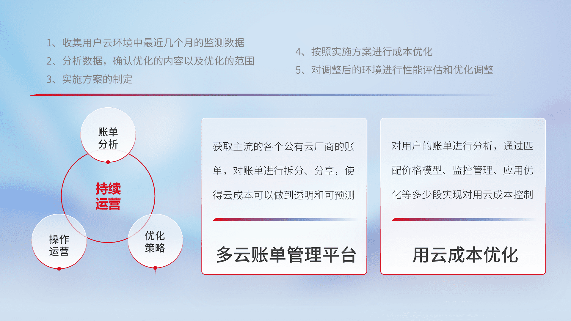 通过多云纳管,,,,以统一的资源数据模型把客户的云资源进行抽象和封装,,,,进而实现对多云资源的统一操作,,保障云资源管理的可靠性、、、、稳定性与可用性。。量身定制化运维内容,,,配置、、、开发运维、、、补丁管理、、备份、、、监控、、认证和访问管理、、、、审计和日常巡检等,,,,保障在用云过程中的可靠度,,稳定度以及高可用率。。。。