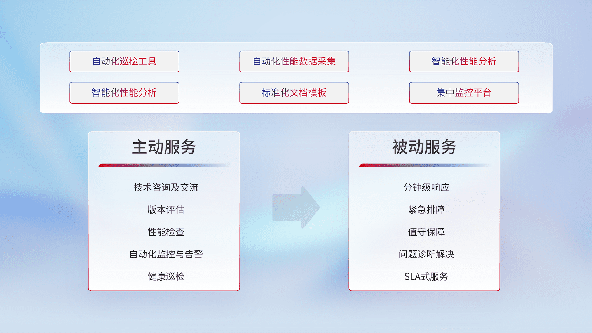 智能化工具和标准化文档,,保障服务质量,,,提供主动服务(包含技术咨询、、版本评估、、性能检查、、、自动化监控与告警、、健康巡检)和被动服务包含(分钟级响应、、、紧急排障、、值守保障、、、问题诊断解决、、、、SLA服务)。。。
